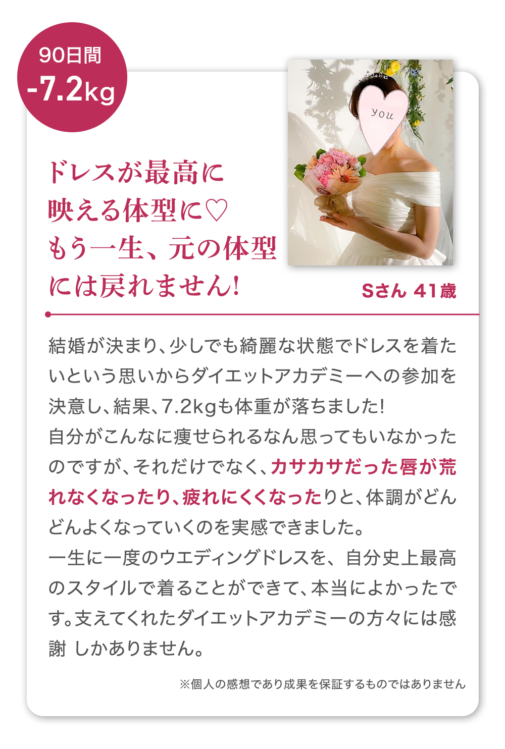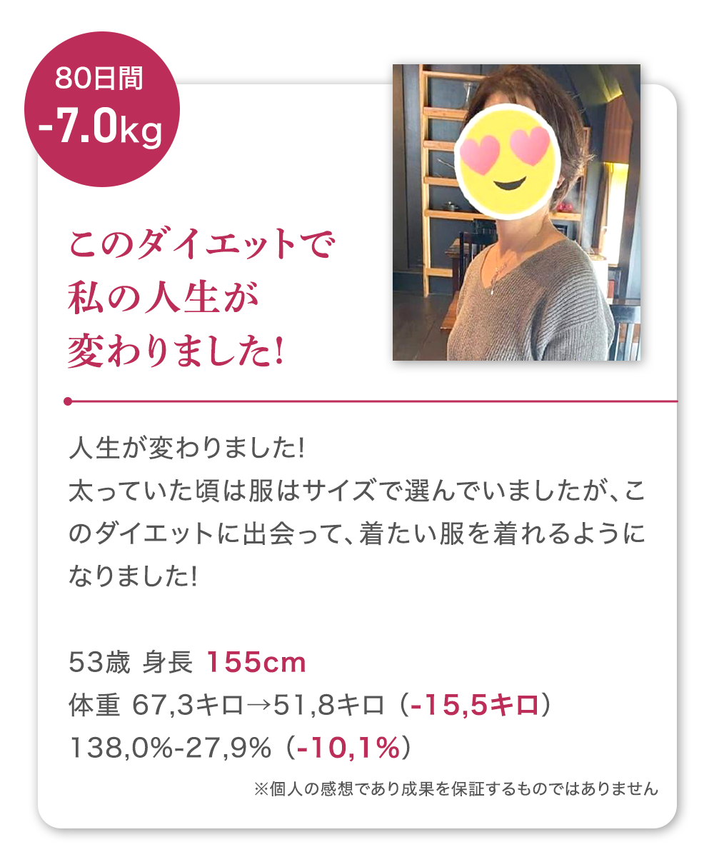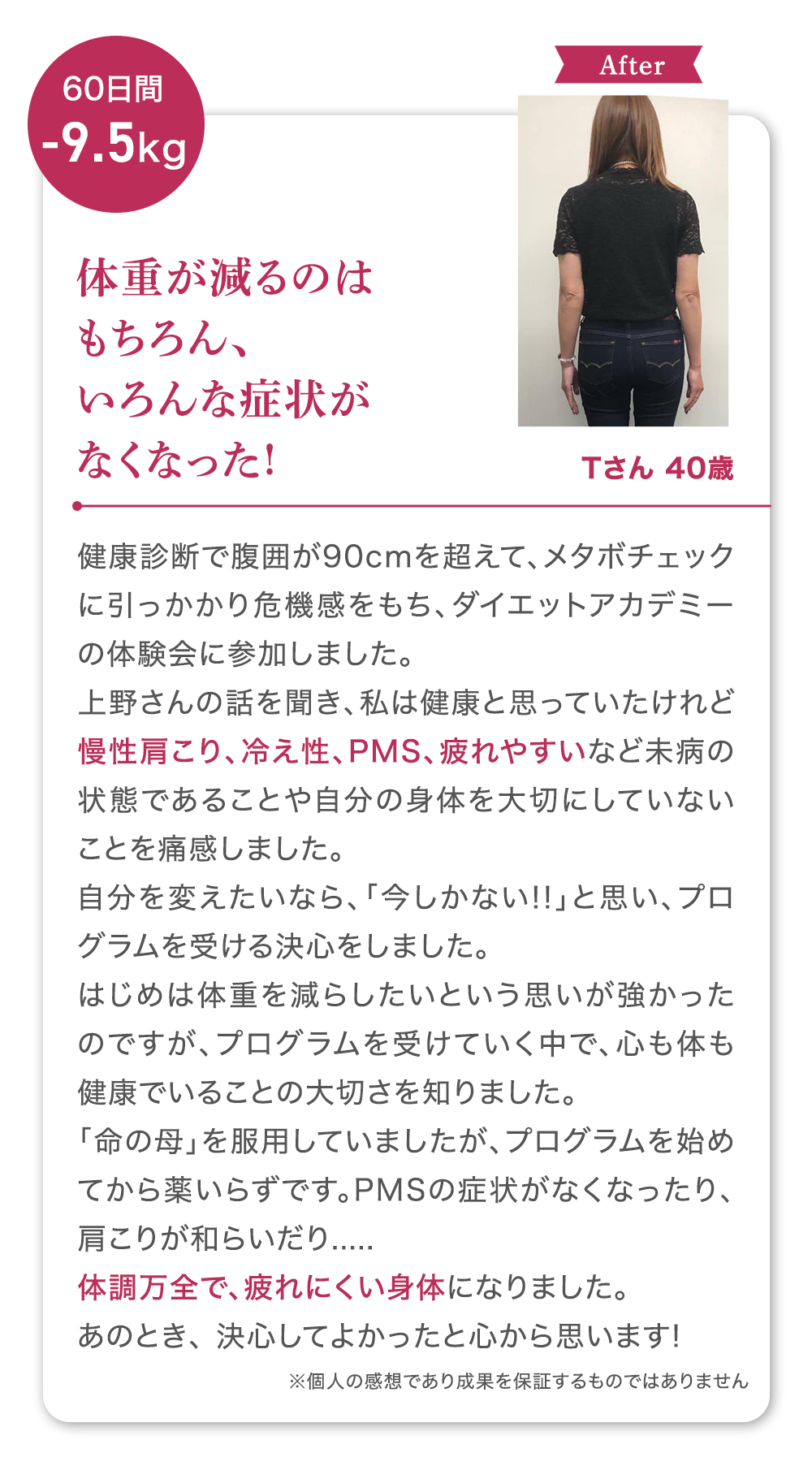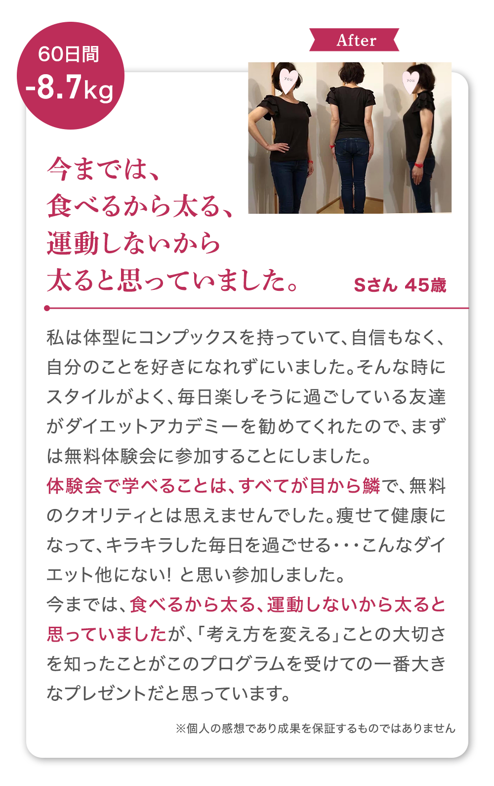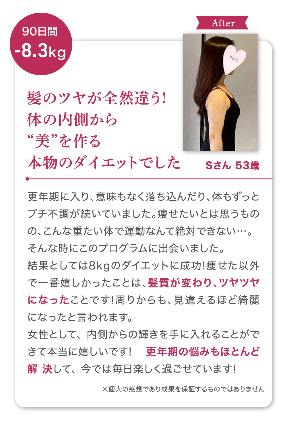 この結果が、ダイエットをするのに、健康になるのに、女性として美しくなるのに何歳からでも遅すぎることはないと、証明してくれています。