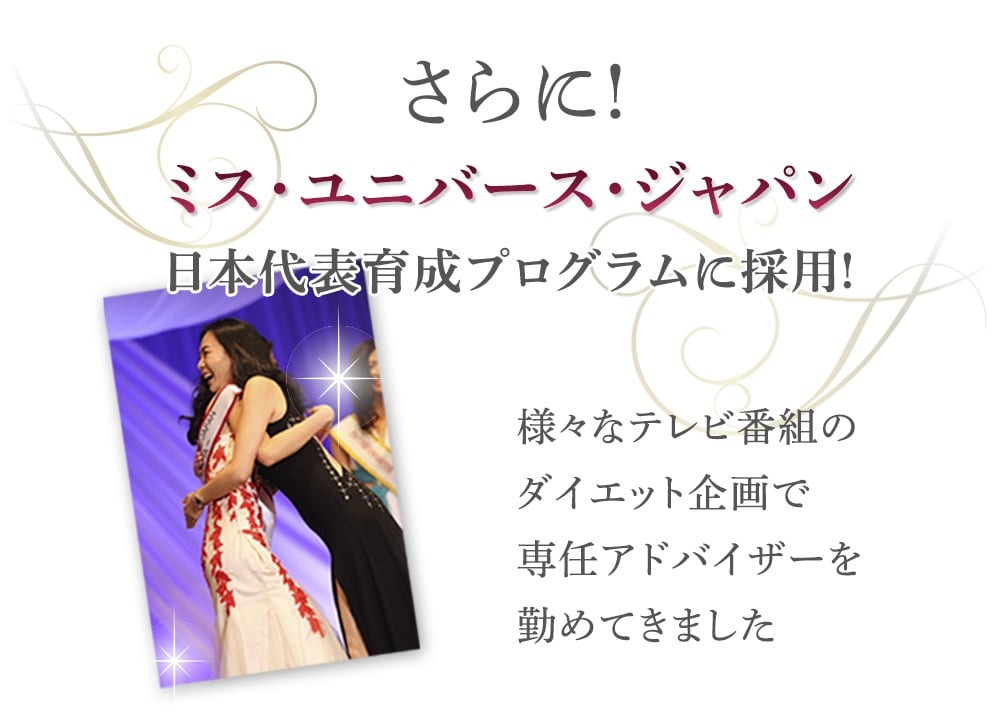 野さんはこれまで2214人以上の方のダイエットを成功に導き、肌荒れ、肩こり、便秘、むくみ等の体質改善はもちろん、心の健康も取り戻すことからミス・ユニバースジャパン大会ディレクターと育成を歴任している方です。