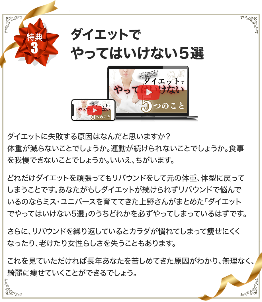 上野さんによると、ほとんどの方が無駄なダイエットや情報に踊らされ、運動、過度な食事制限、サプリメントなどによって本来求めている美しさを手に入れられないでいるそうです。