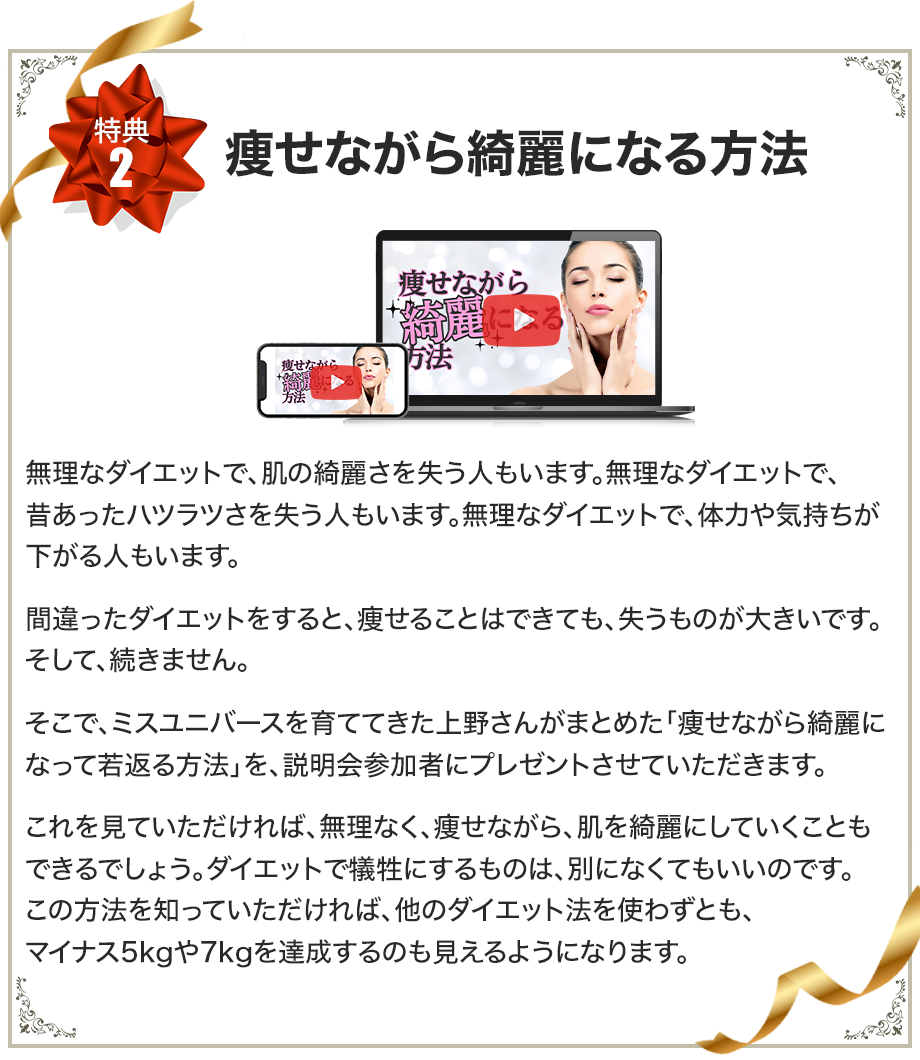 と言いますのも、この体験会ではダイエットアカデミーの説明だけでなくダイエットや健康についての本当の知識やノウハウなどもお伝えしますので、あなたに聞き逃して欲しくないからです。